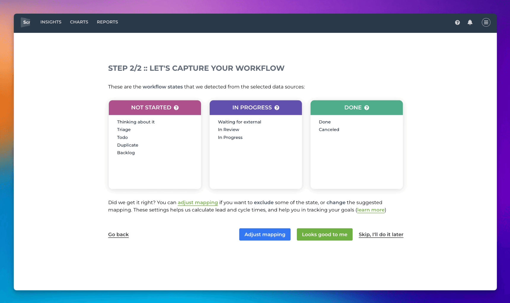 If the suggested mapping looks correct, you can accept it by clicking Looks good to me. You are done, and you can navigate to the Insights tab to see the automatically generated charts and metrics.