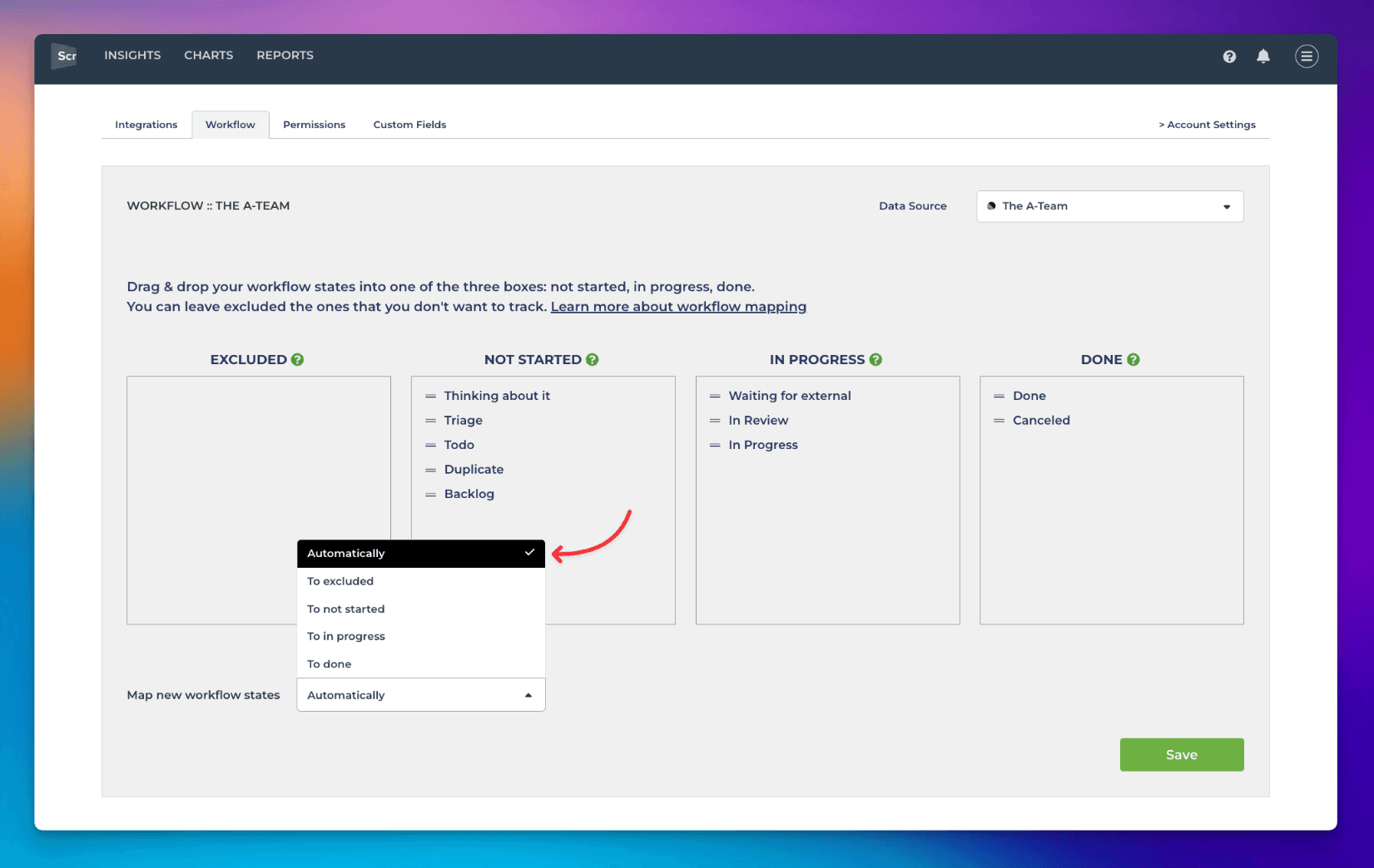 You can choose to map automatically to either Not started, In progress, or Done, or Excluded, in which case they are ignored. If you select Automatically, new states are mapped automatically by AI.