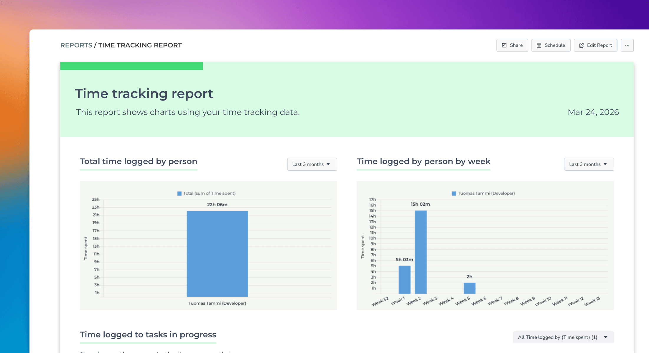 Time tracking lets your team record the time they spend working on tasks. If you have enabled time tracking on any of your ClickUp boards, the Time spent will be automatically imported and made available for Screenful charts.