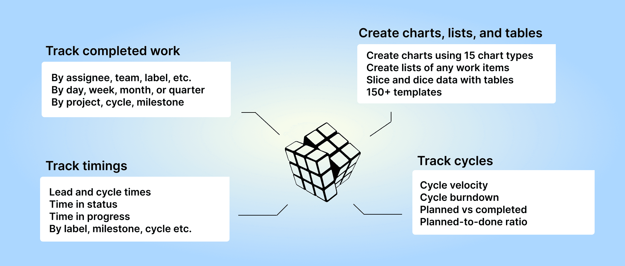 Screenful provides multidimensional analytics of the data in Linear. You can slice & dice your data with 15 different chart types, and click through to drill into details.