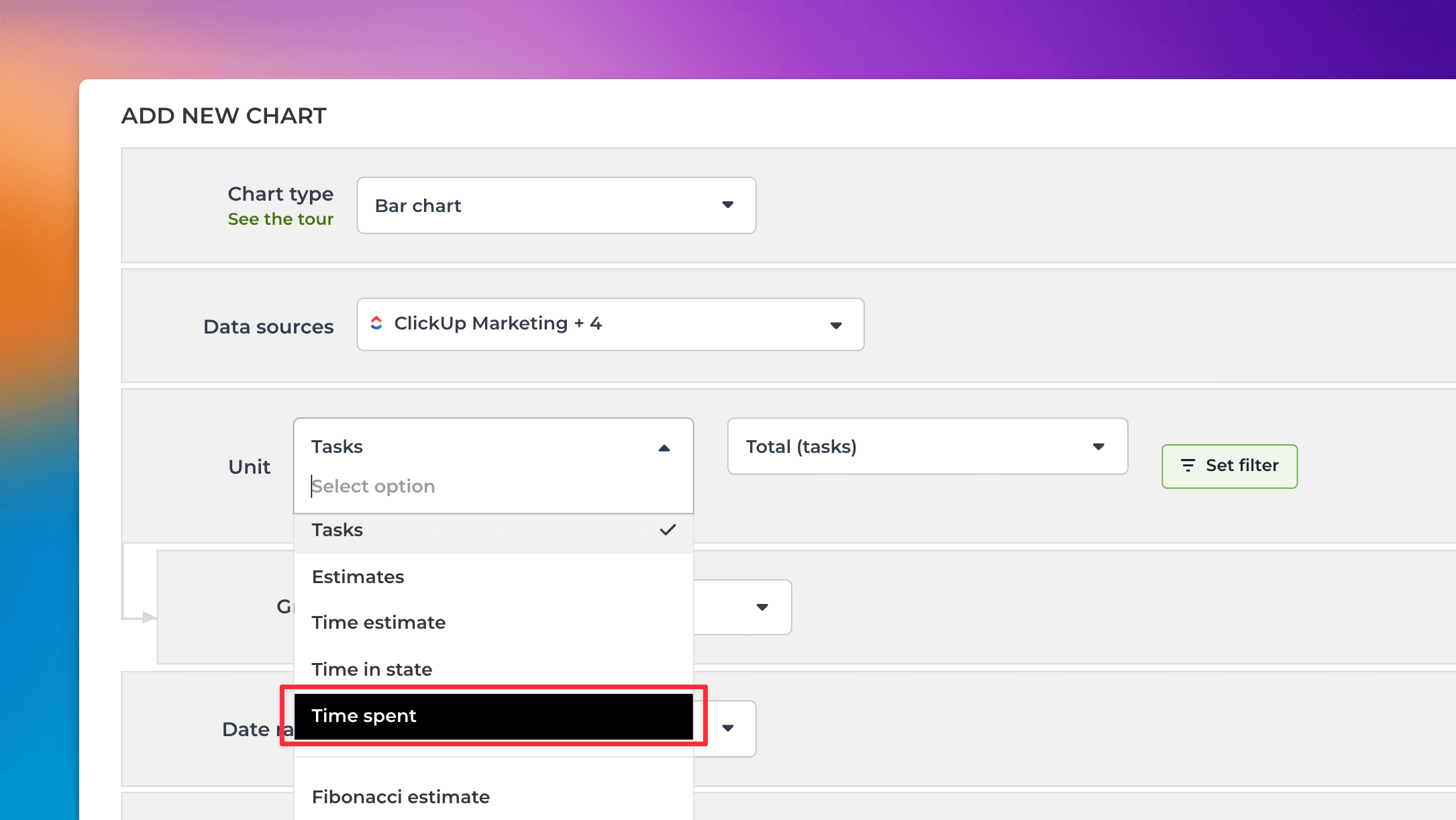 To create a chart using time tracking data, start by clicking Add new chart in the Charts tab. Select Time spent from the Unit menu: