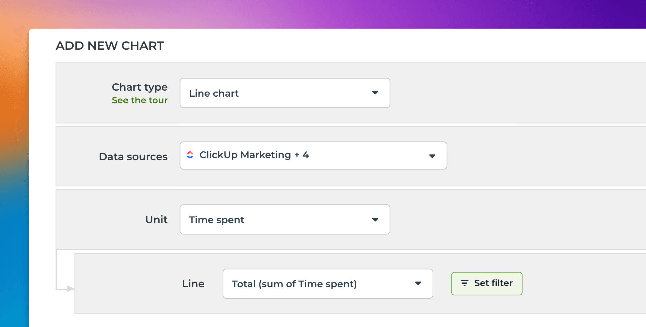 When Time spent is selected as the Unit, the Metric menu contains only one option: Total (sum of Time spent). Here’s an example configuration of a line chart that shows the total amount of hours logged over time: