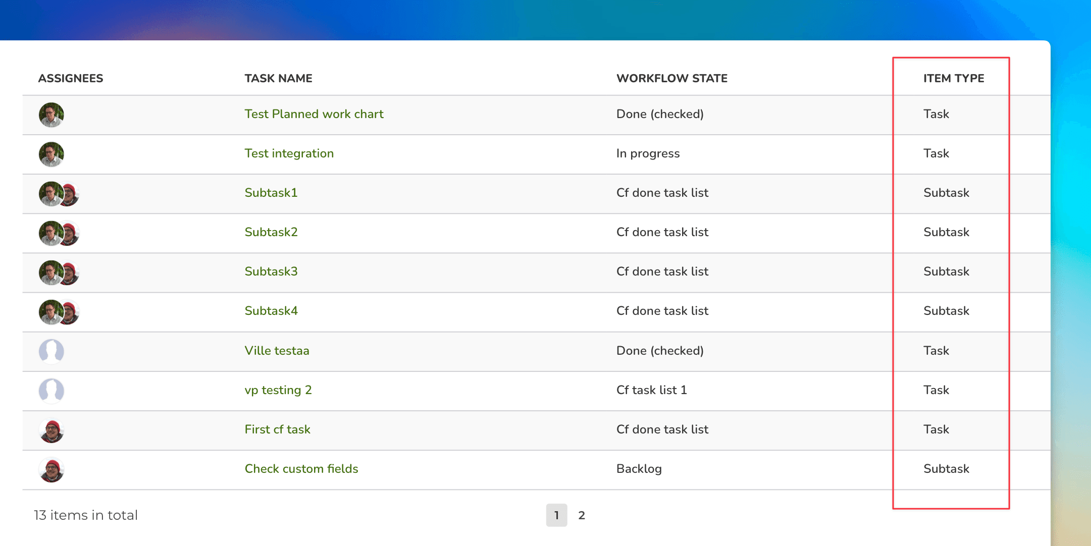 Now each row in the table corresponds to the top-level task, and the metrics shown in columns are the summaries from the subtasks. For example, a column can show the total number of subtasks for a parent, the total number of completed subtasks, or the number of story points assigned to subtasks.