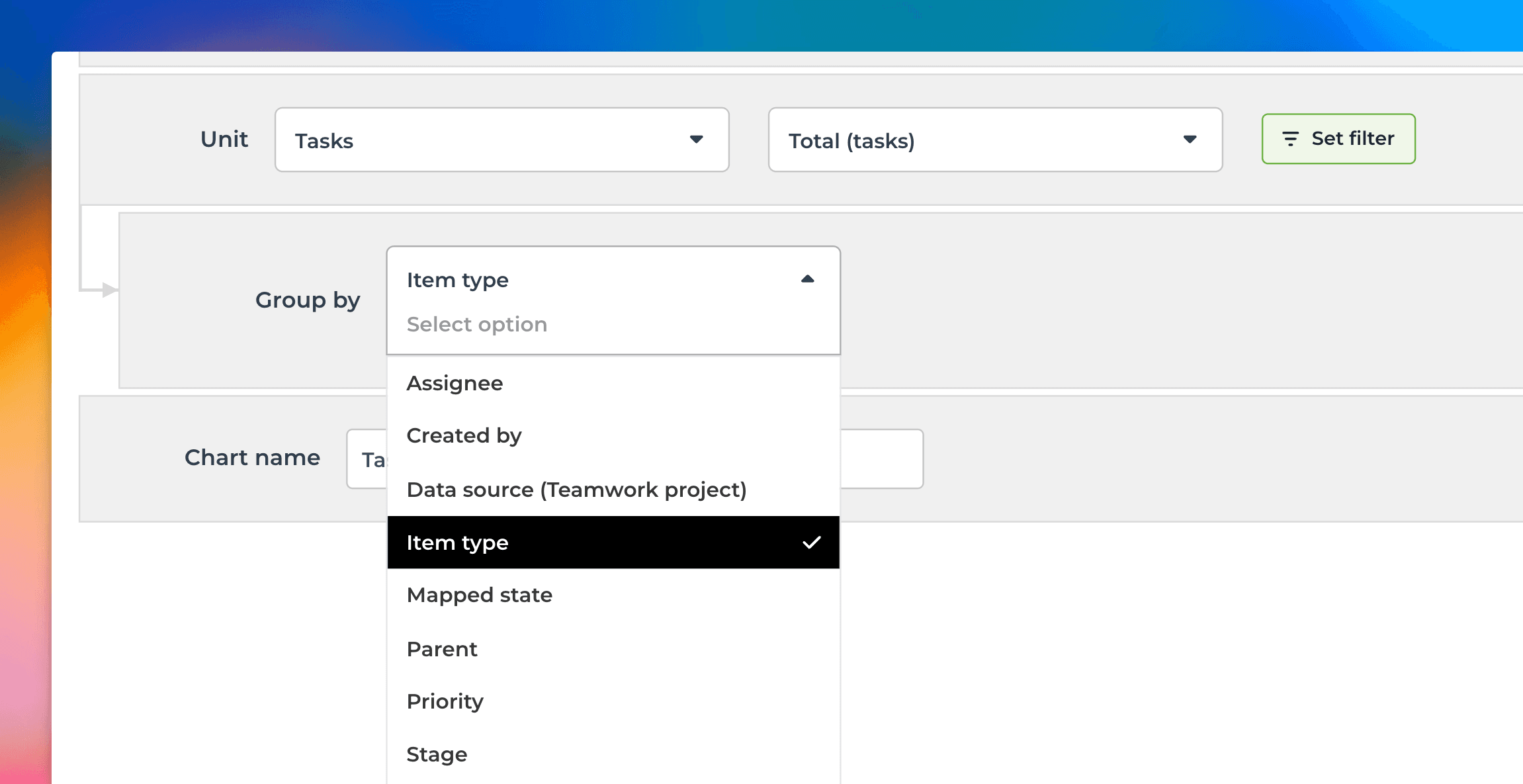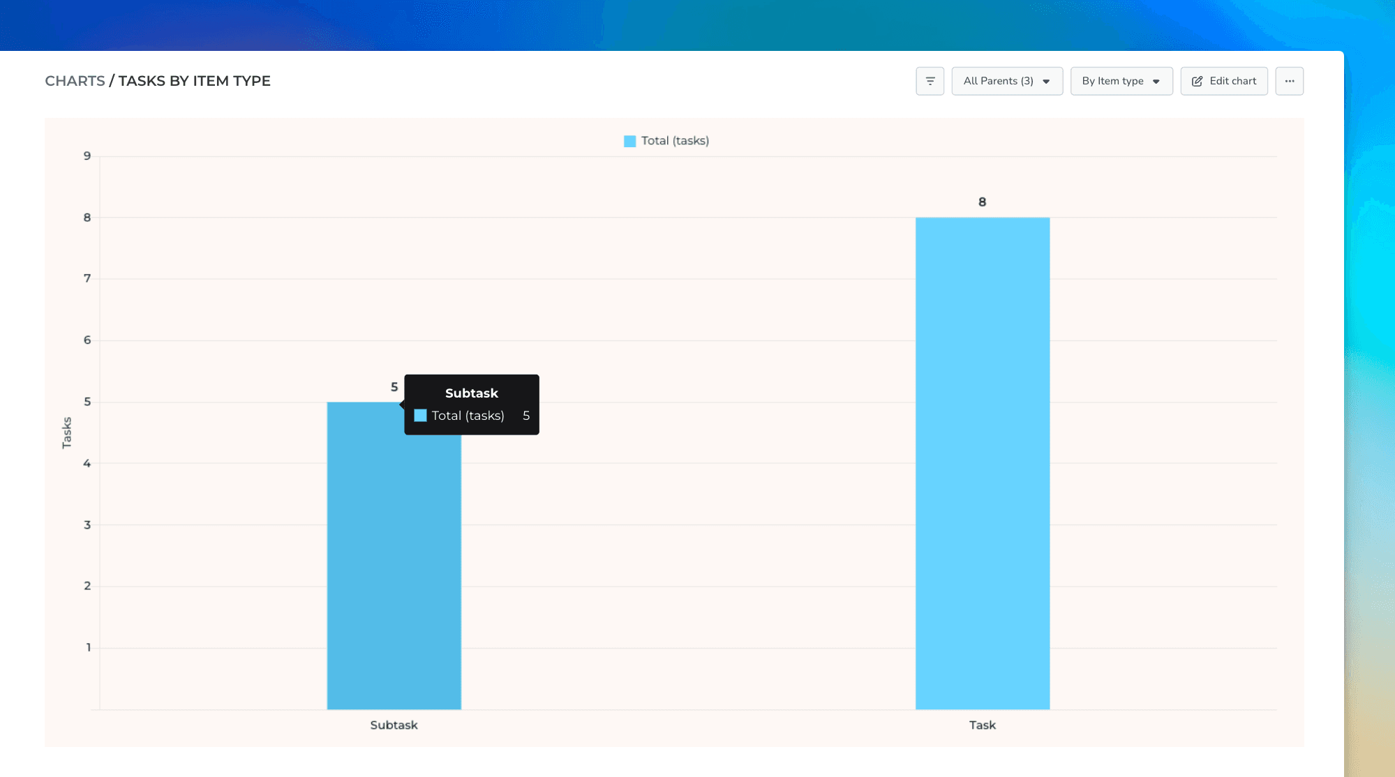 With the charts that support grouping, such as pie chart or bar chart, you can group data by item type. This shows the distribution of your tasks and subtasks in your data:
