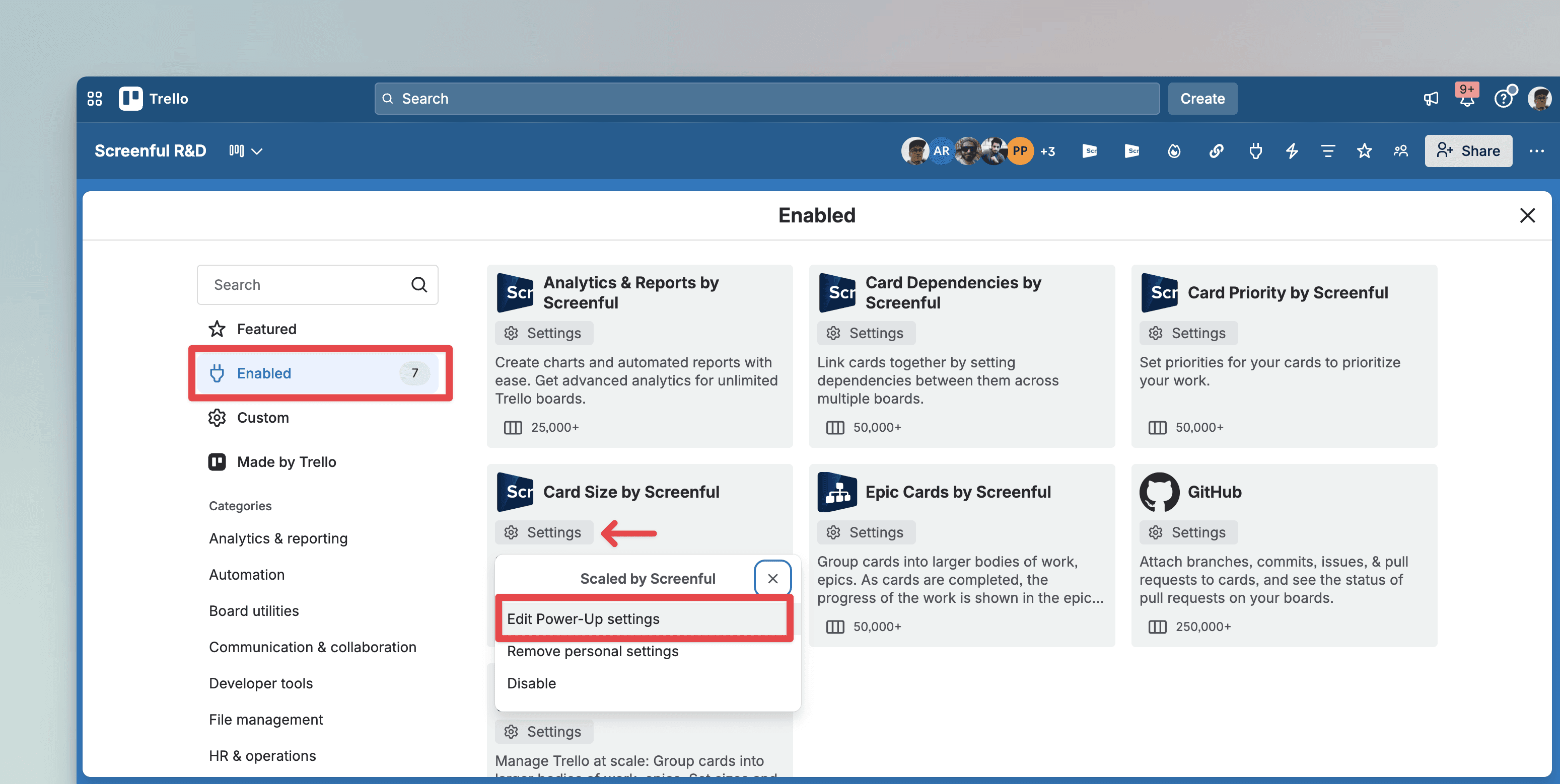 2) Select Enabled from the left side menu to see the Power-Ups enabled in that specific board. Click Settings to open the Power-Up settings. Select Edit Power-Up settings: