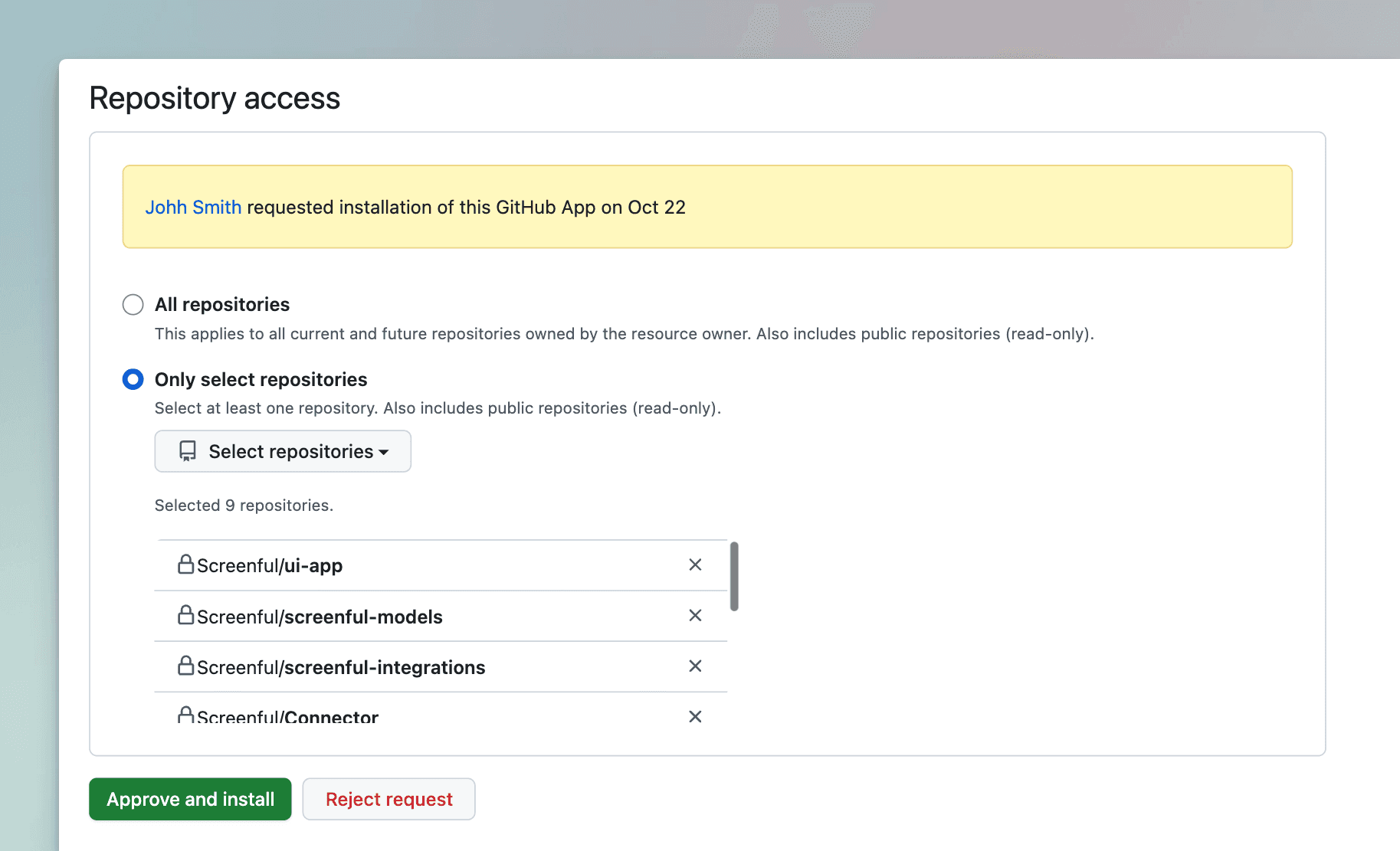 When adding data sources, you may not have all the repositories available in the menu. You can fix this once you have you have authorized the Screenful app for your personal account and created your first data source.