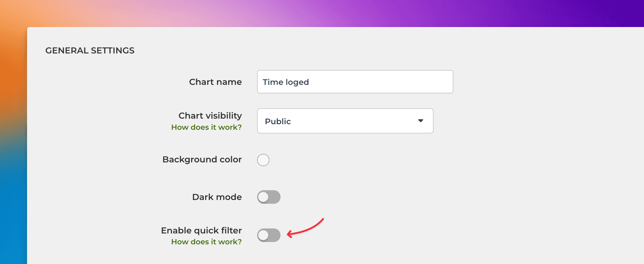 In the chart settings, use the toggle to enable the quick filter. Clicking the toggle reveals the filter options. Select Time logged by (Work logged) from the list: