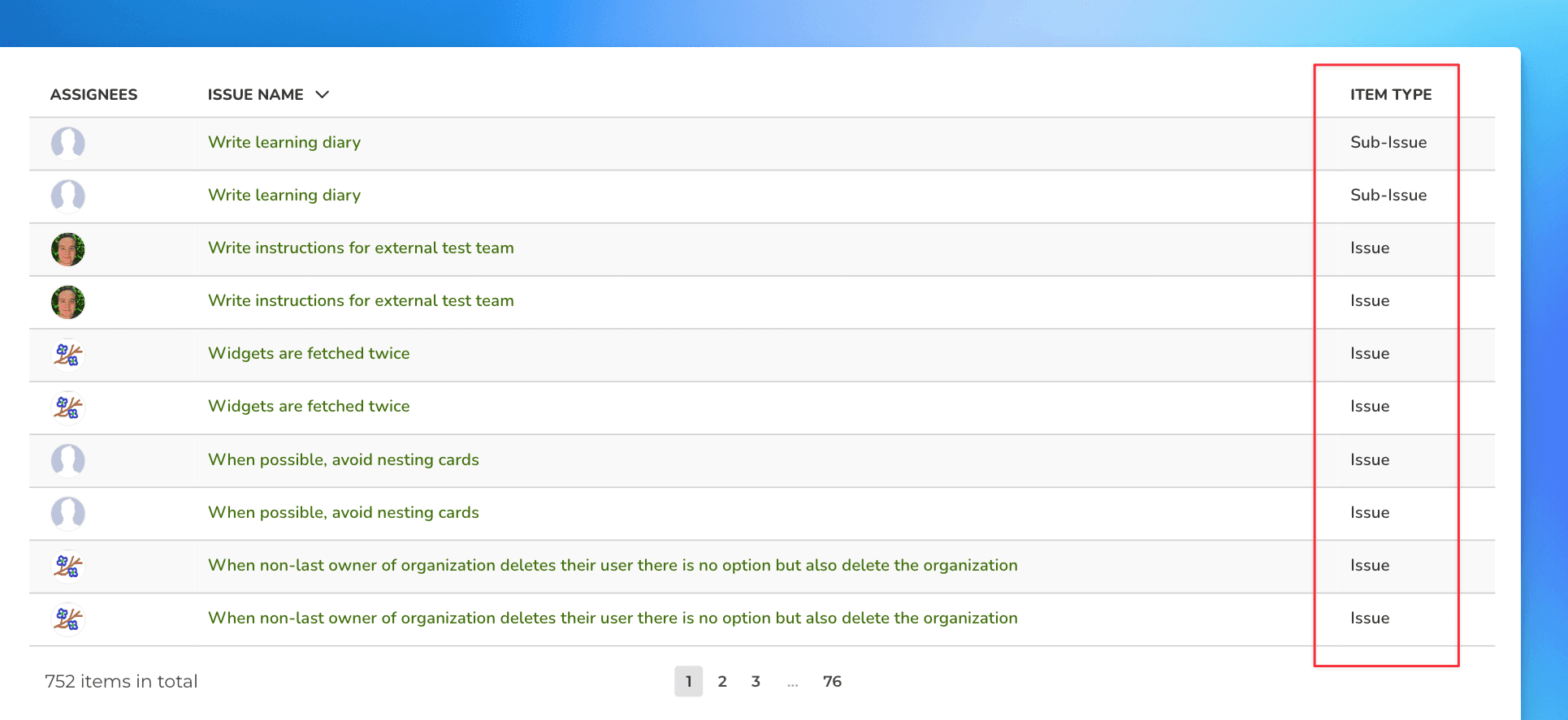 Now each row in the table corresponds to the top-level issue, and the metrics shown in columns are the summaries from the sub-issues. For example, a column can show the total number of sub-issues for a parent, the total number of completed sub-issues, or the number of story points assigned to sub-issues.