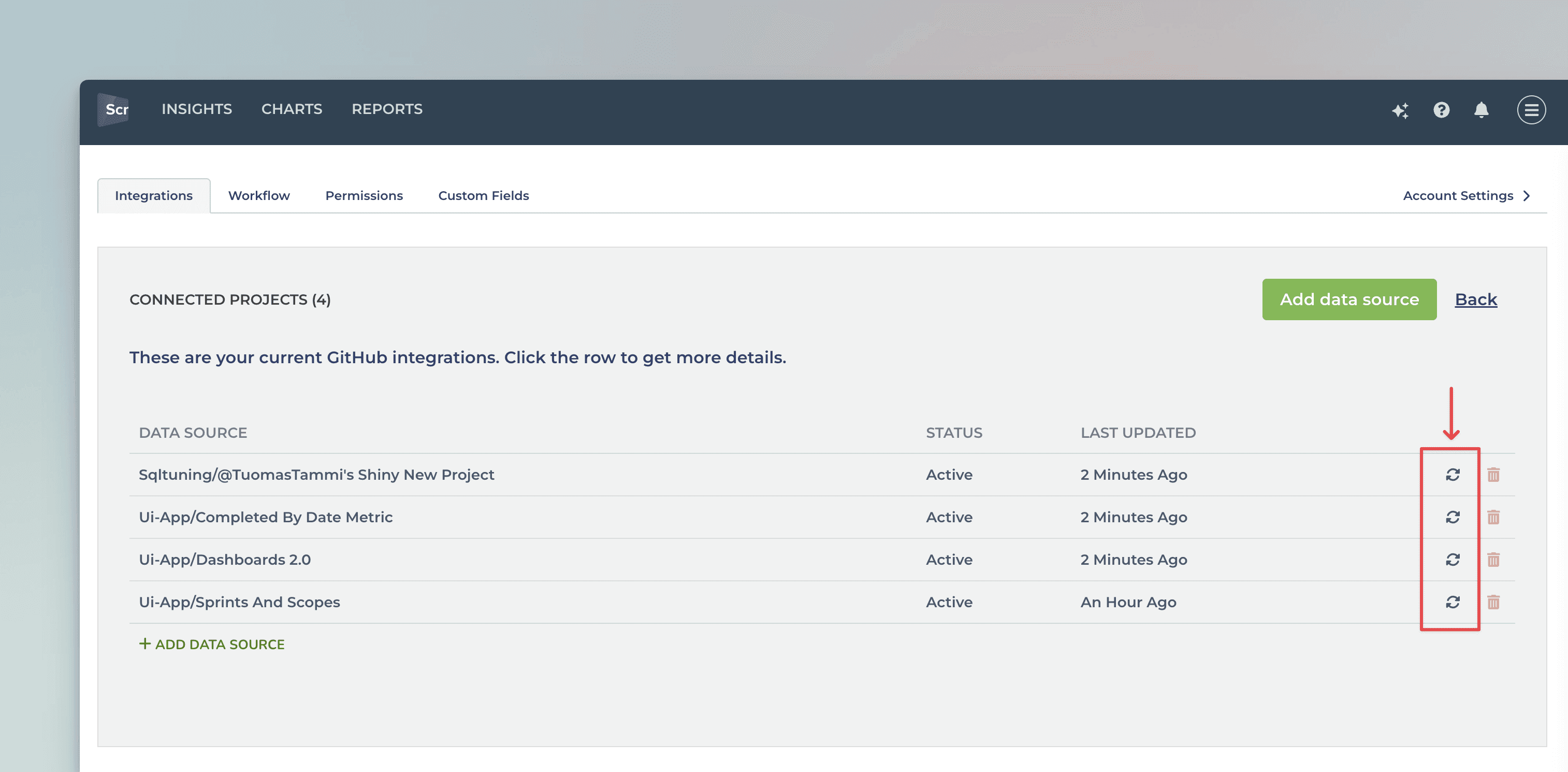You'll see a list of current integrations, and you can trigger a sync by clicking the sync icon: