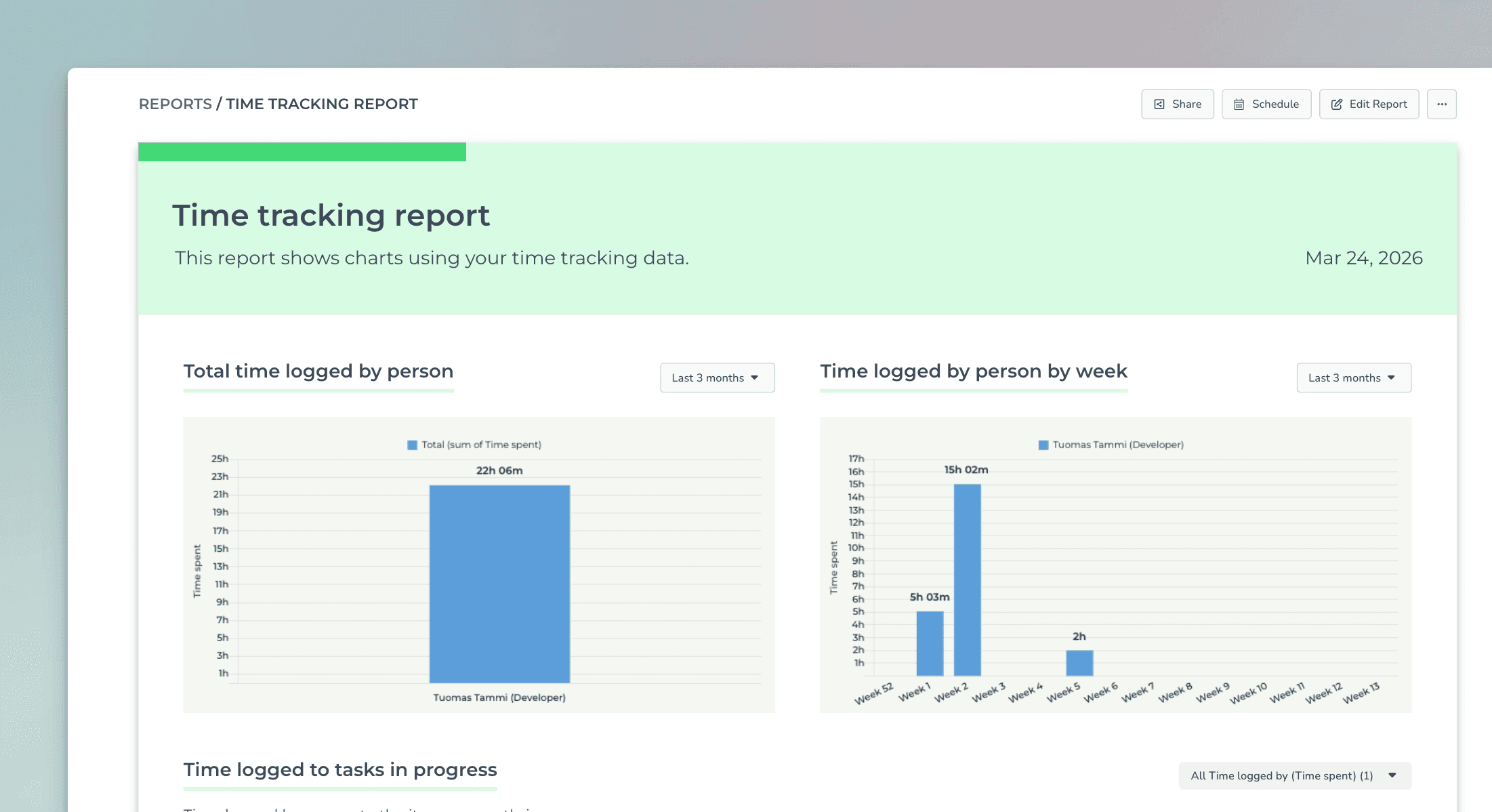 Now the Time spent and Time logged by (Time spent) show the total time logged for tasks within the specified date range. You can use the filter feature to narrow the list to any subset of tasks.