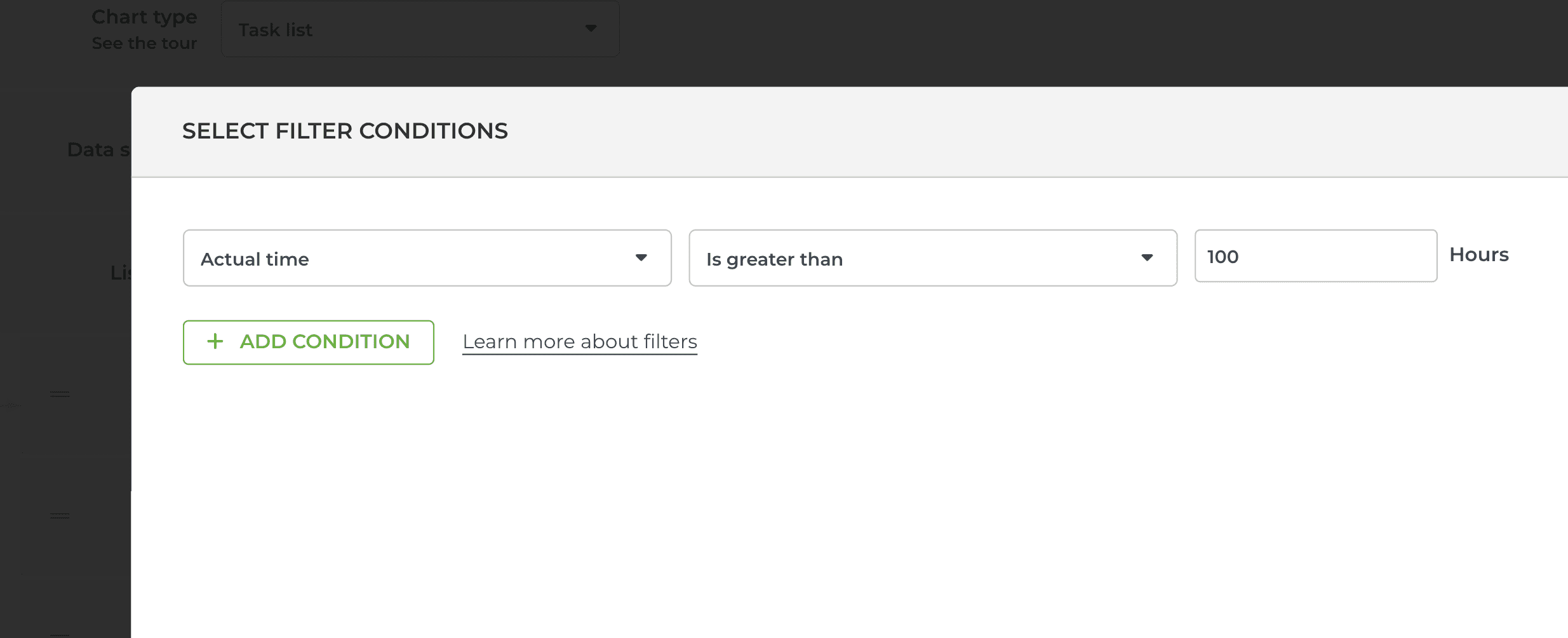 When you click the Set filter button in any of those views, the same filter modal is shown: