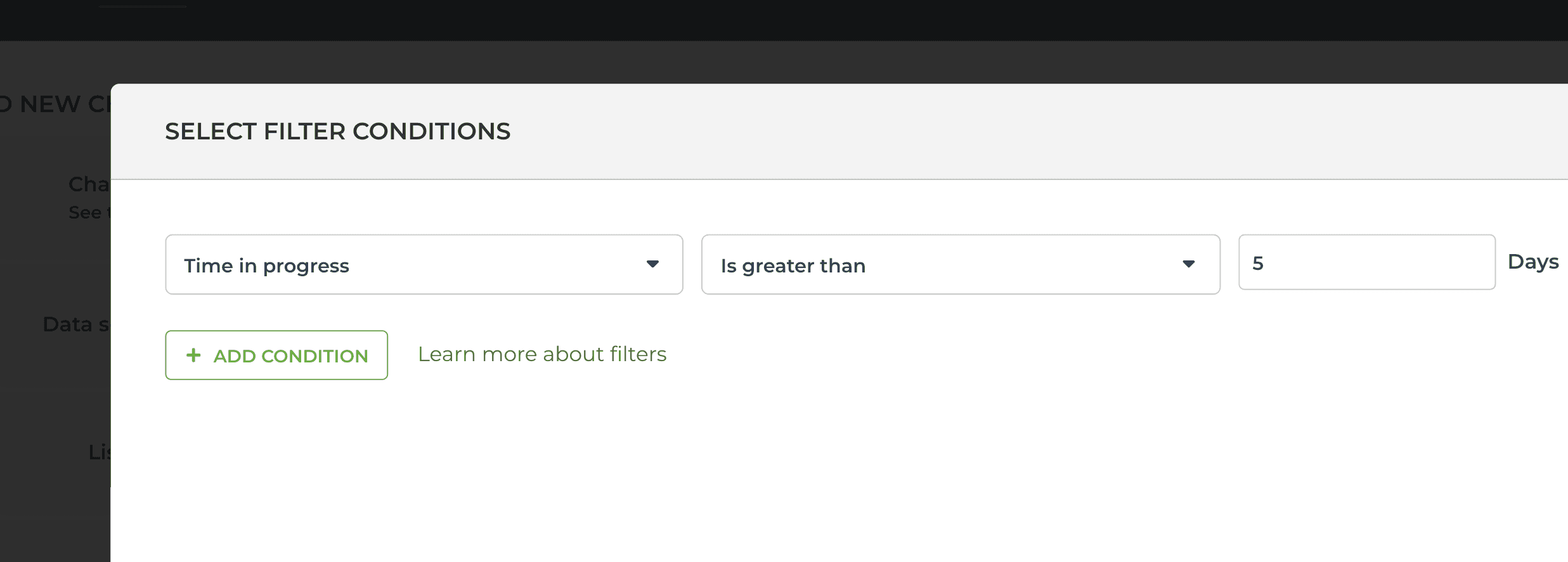To find items that have been in progress for longer than a certain number of days, select Time in progress from the filter menu: