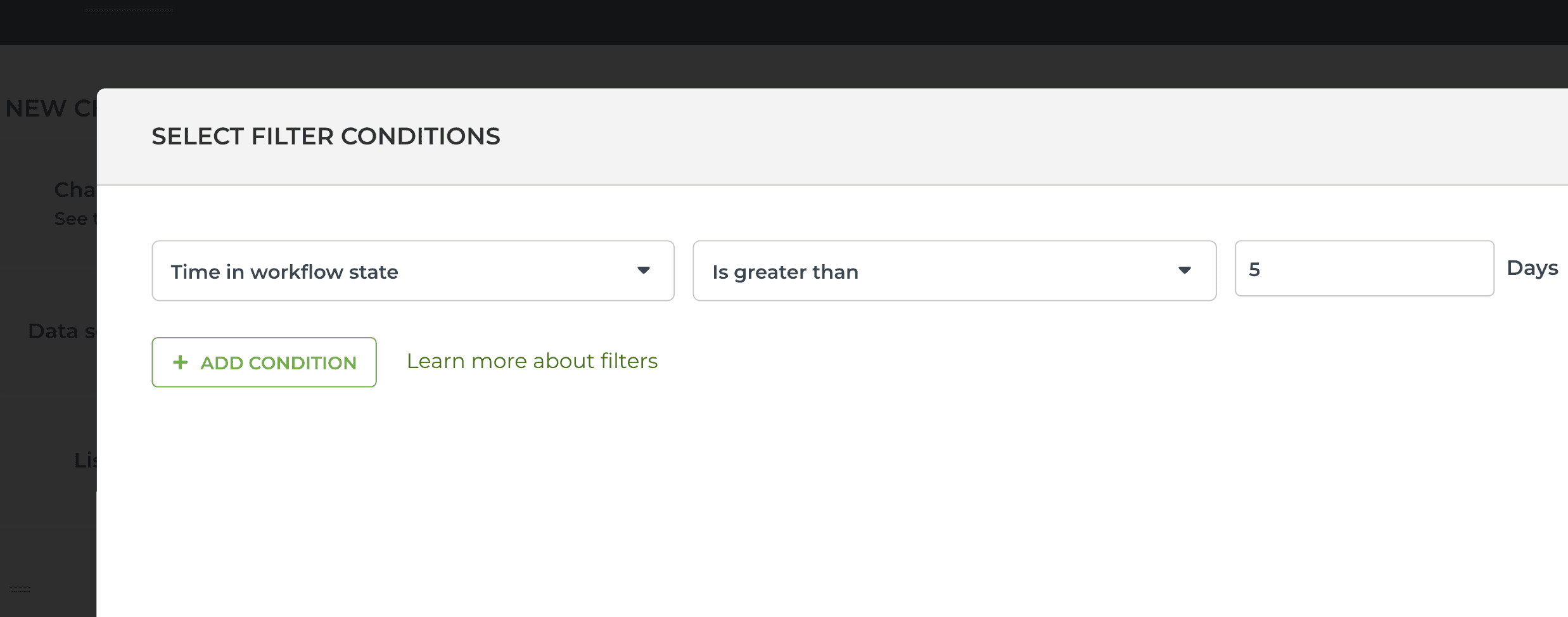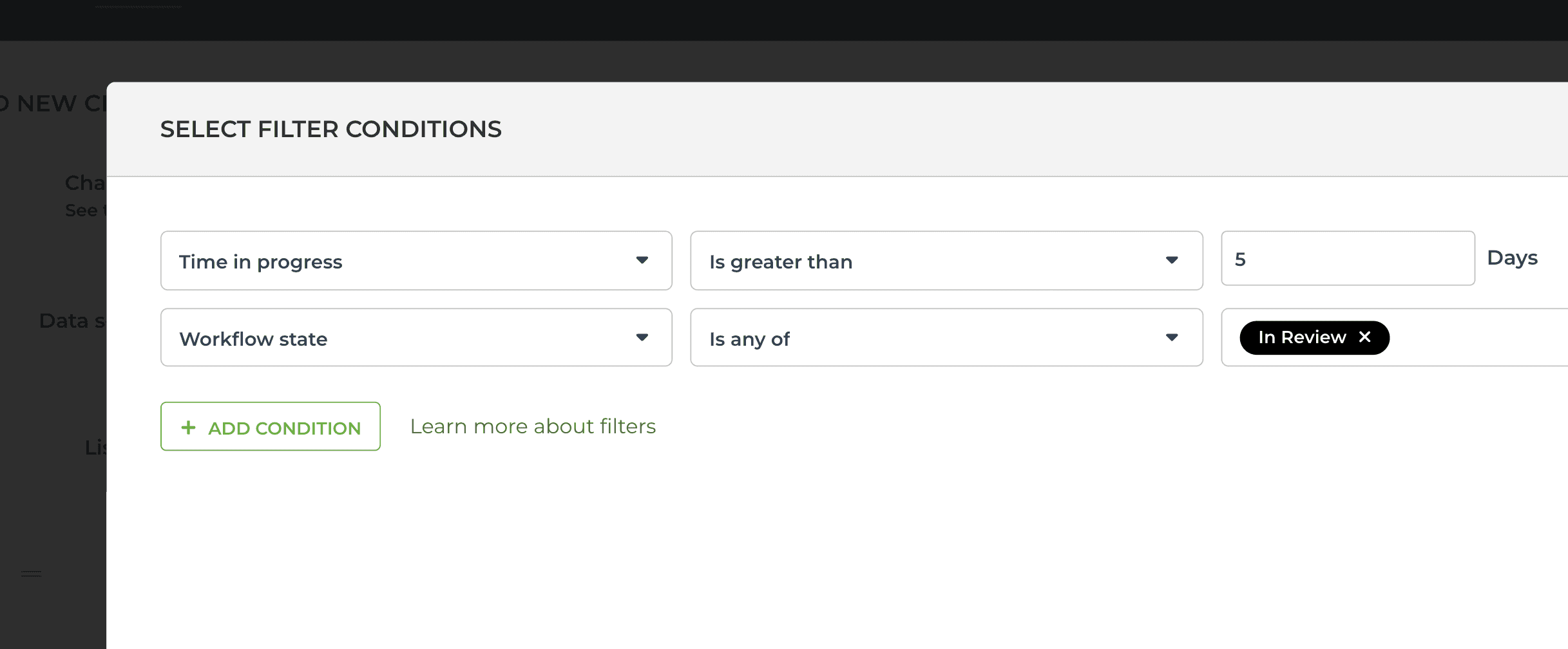 To find items that have been in their current workflow state for longer than a certain number of days, select Time in workflow state: