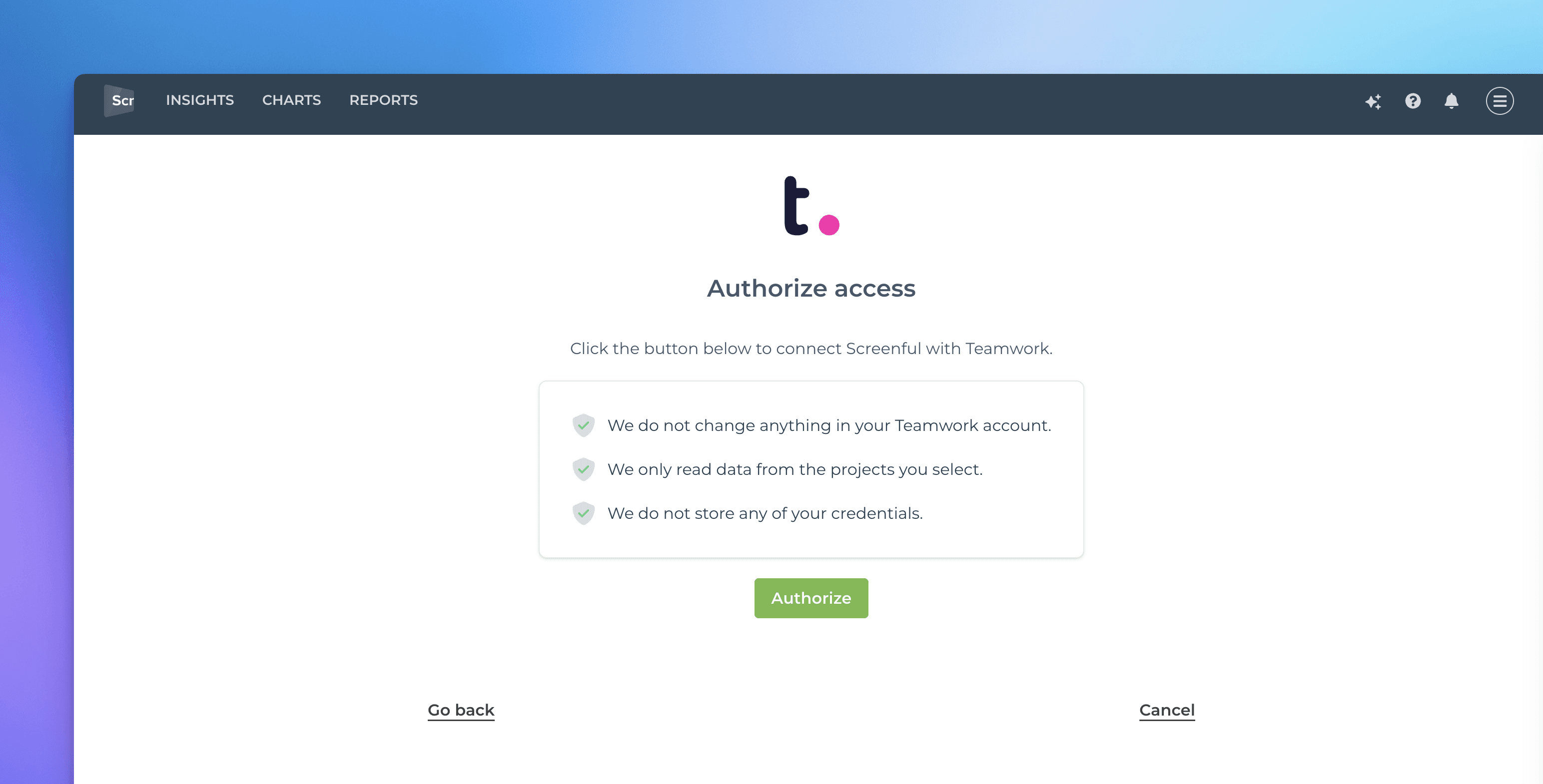 You’ll need to grant Screenful access to the Teamwork API to get started. After that, you’ll see a list of spaces. Choose one or more project to import into Screenful.
