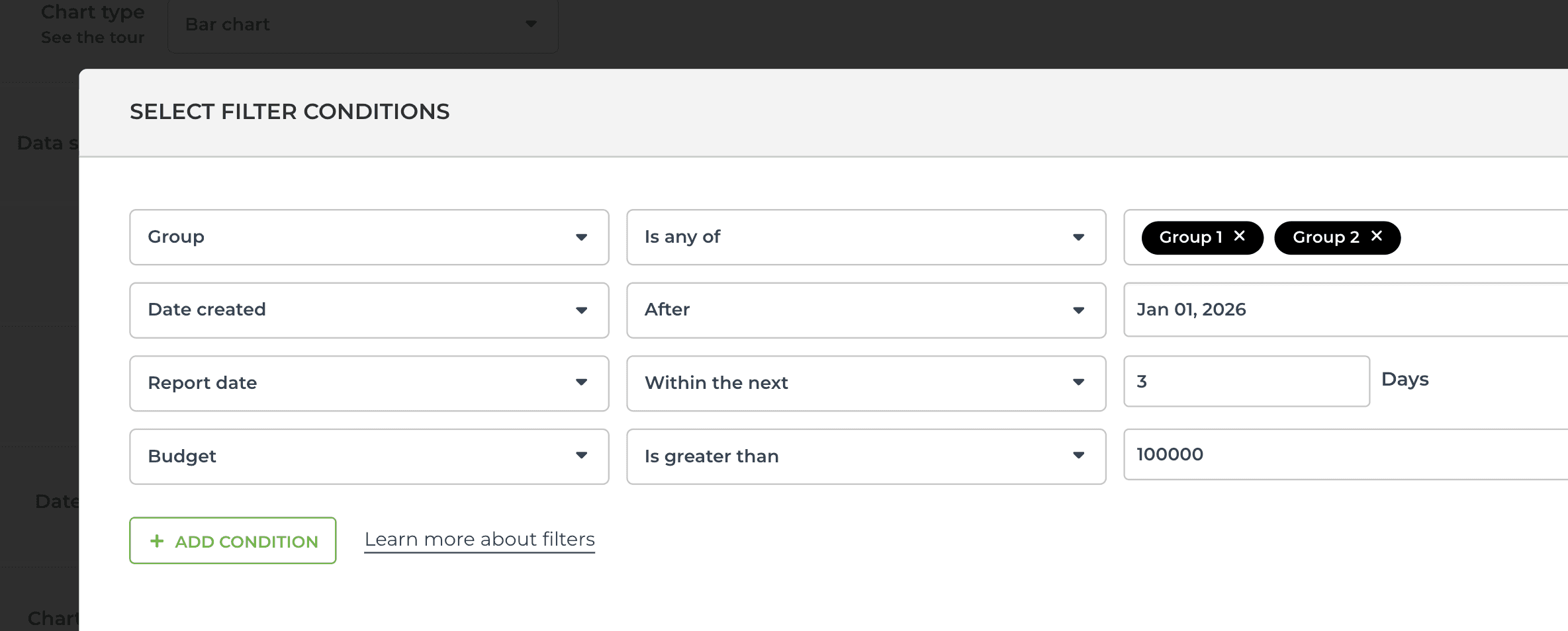 You can filter charts by any of your number fields. You can find them in the filter options, and you can do comparisons such as is greater than or is less than: