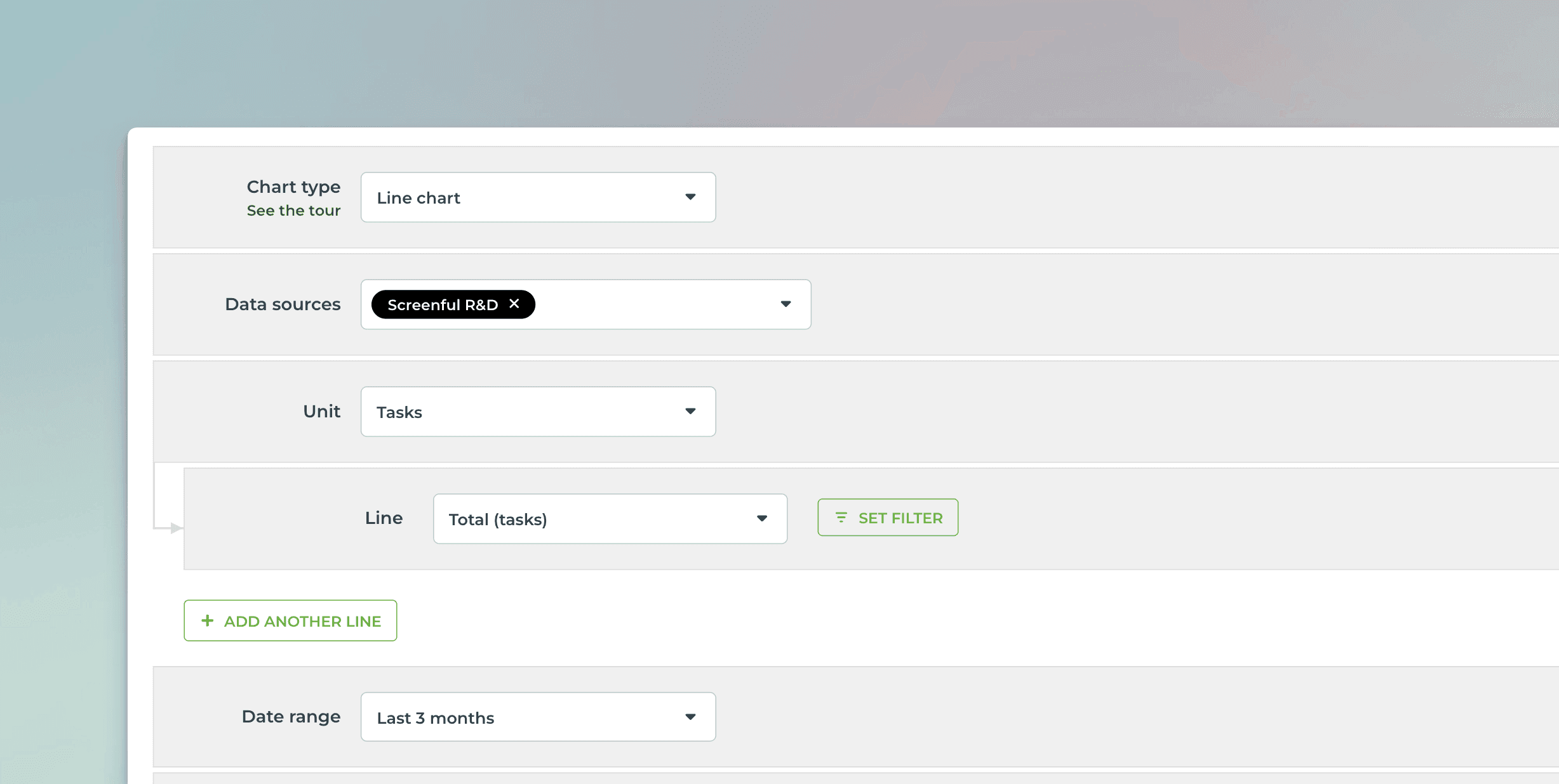 Track metrics with a Line chart and see the longer-term trends. You can compare multiple metrics, such as work created and work completed vs. work in progress. You can also see trends in timing metrics, such as cycle time or how much work has been logged (in a time tracking field) over time.