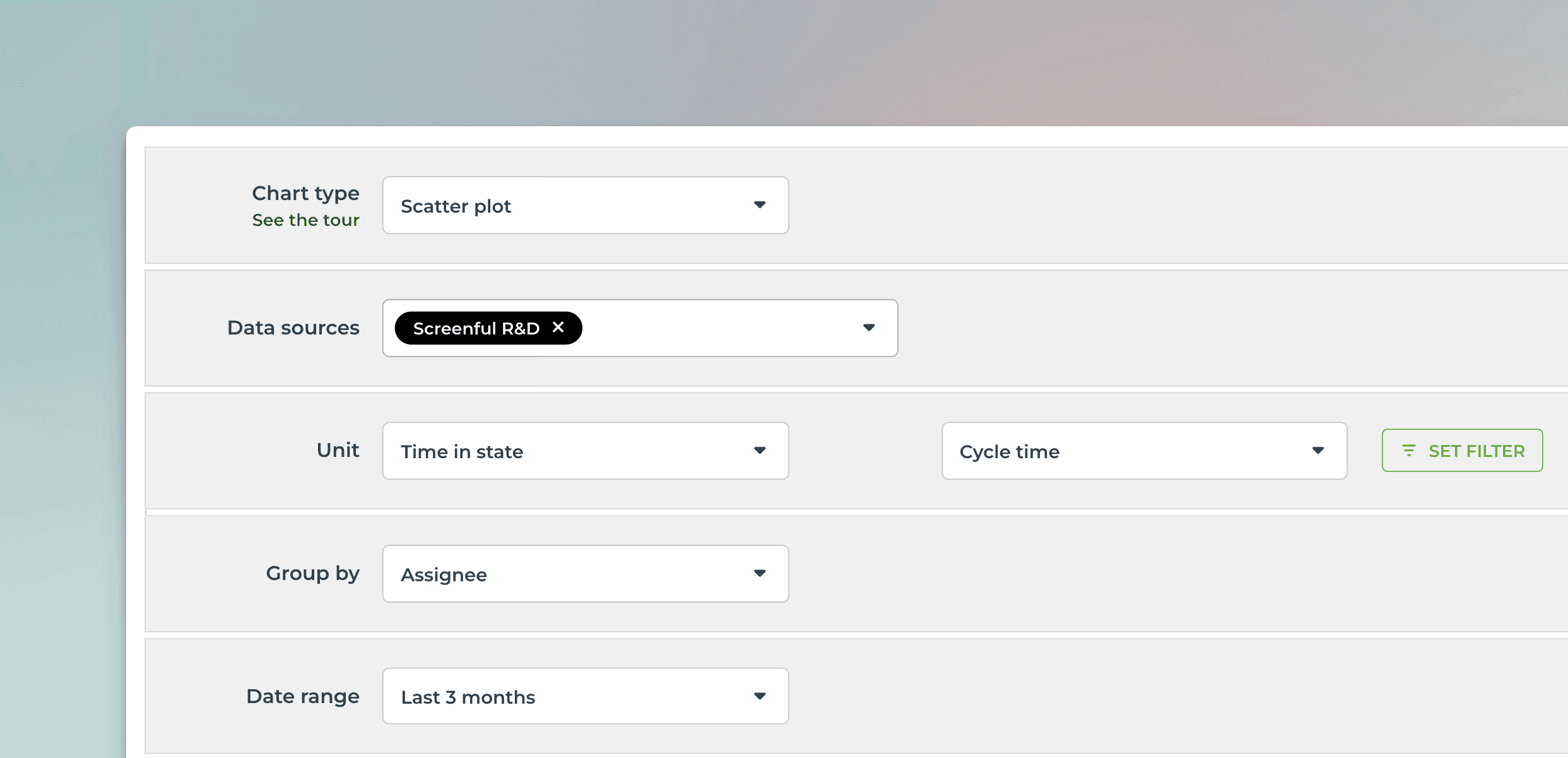 You can filter by any property, such as task type (bug, user story, new feature), assignee, label, or epic.